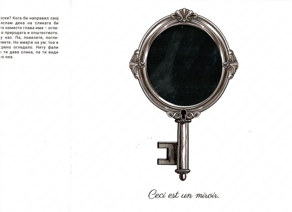 Огледалото е истовремено и клуч, но истовремено и клучалка. И тоа е веќе премногу. Затоа што тоа е како човек што наместо глава има аквариум со риби, а во раката држи мрежа. А потоа тоа е и како ној што… ќе ја закопа ли главата во дупката во песокот, или клучот таму ќе му попречи?